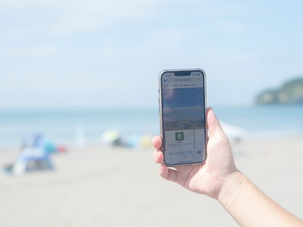 At Yuigahama Beach, the specific areas where rip currents are occurring are displayed with a frame on the monitors at the lifeguard station. Starting in 2025, beachgoers have been able to identify rip current areas visualized by the “Water Safety Eye” web app using the AR functionality on their smartphone screens.Now it’s easier to tell in which direction a rip current is forming from your location.