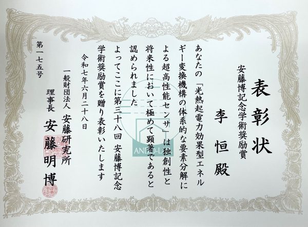 本学理工学部電気電子情報通信工学科助教 李 恒が、「第38回 安藤博記念学術奨励賞」を受賞しました。
