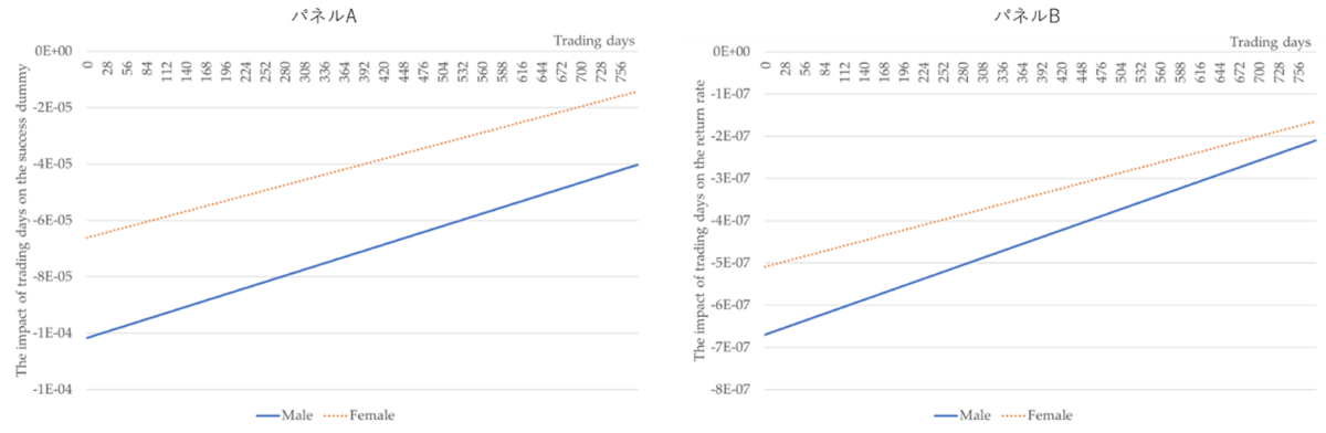 - 取引頻度と収益性:男性は女性と比べて取引日数が増えるほど収益性が低下しやすく、自信過剰バイアスの影響が大きいことが示唆されます(図1)。