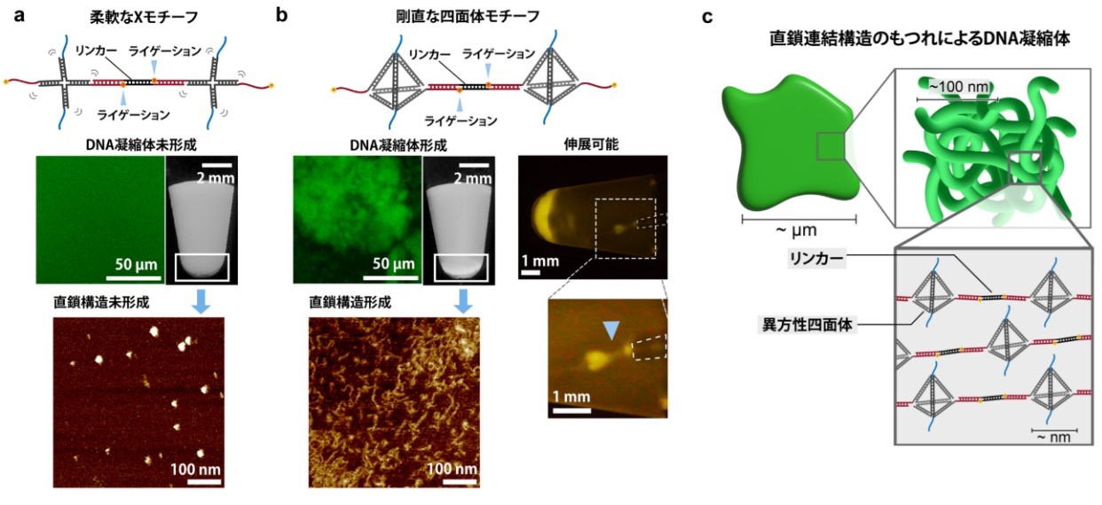 私たちは、直交(用語2)する粘着末端(用語3)を利用して一方向にモチーフを連結することで、異方的DNAナノ構造を構築しました。DNA凝縮体の構築にしばしば使われる柔軟性を持つX字型モチーフ(「Xモチーフ(用語4)」)と、異方性を持つ硬い四面体モチーフの2種をつくり、それらを比較したところ、四面体モチーフでDNA凝縮体の形成が確認されました。これは高剛性の四面体モチーフからなる紐状の構造のもつれによって形成されたと考えられます。