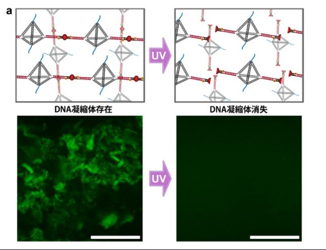 さらに、本材料の応用可能性を探るため、外部刺激による制御を試みました。光分解性スペーサー(用語5)をリンカーに導入することでUV照射による凝縮体の解体と、細胞透過性DNAナノ構造体の放出を実証し、制御可能な薬物送達キャリアとしての特性を示しました。また、温度刺激にも応答することを確認しました。