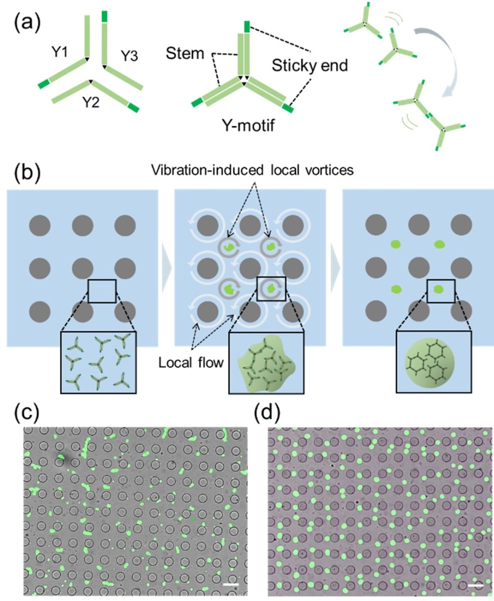 (a) 4nt Yモチーフ構造の模式図および粘着相互作用の原理。(b) VILV場内における均一凝縮体の形成過程の模式図。(c, d) マイクロピラー配列とDNA凝集体(緑)をそれぞれ示す、明視野観察と蛍光観察の合成画像。スケールバー = 100 µm。(c) 振動なし4時間後の画像。(d) VIFを10分間印加後3.5時間後の画像。