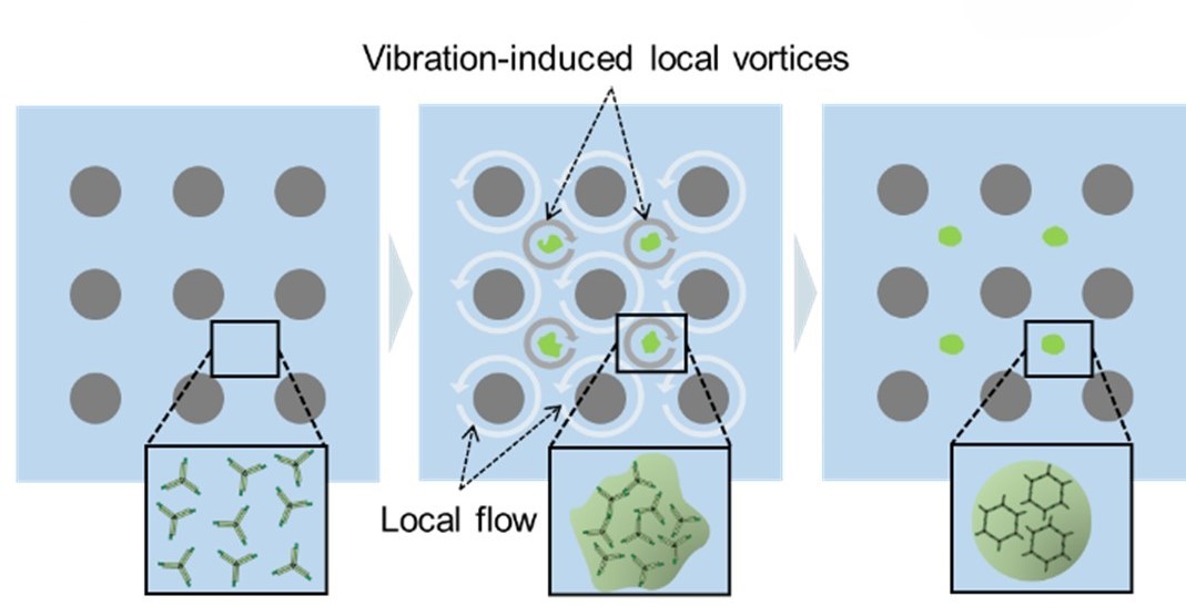 中央大学理工学部の鈴木 宏明教授、早川 健教授、大学院理工学研究科学生の黄 之泰(Zhitai HUANG)、金子 完治(当時)、米山 遼太郎(当時)、および東京科学大学総合研究院自律システム材料学研究センターの丸山 智也特任助教、同大学総合研究院化学生命科学研究所の瀧ノ上 正浩教授らの共同研究グループは、マイクロスケールの均一な生体分子凝集体を効率よく作り出す、新しい簡便な手法の開発に成功しました。本手法は、早川教授が開発した振動誘起流れ技術を基盤としており、高価な装置や複雑なマイクロ流路設計を一切必要としません。シンプルな機械的振動だけを使い、細胞環境に近い単一水相の中で凝集体の形成を精密に制御できる、汎用性の高い技術です。